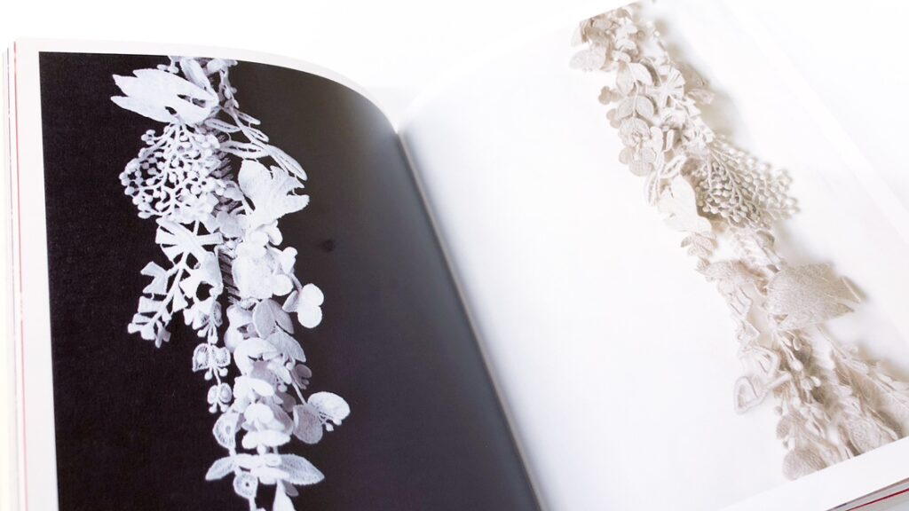この立体刺繍は、水溶性の布に3日かけて刺繍を施し、完成後に布を溶かすという手法で生み出されました。