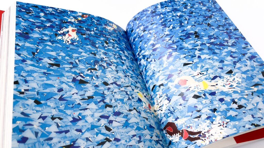 海を泳ぐ選手を描いた「triathlon」では、微妙に色合いを変えたブルー系の紙を何枚も作成し、三角形に切りとった細かい紙片を根気よく重ねていくことで、選手の手が水面をかき上げる波しぶきのきらめきや、海の色の鮮やかさ・深みなどが表現されています。